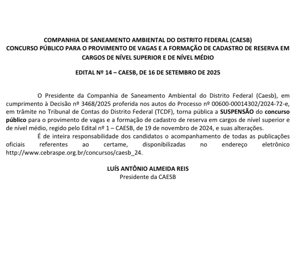 Para mais informações sobre o concurso CAESB, cujo edital foi suspenso, acesse o link abaixo!