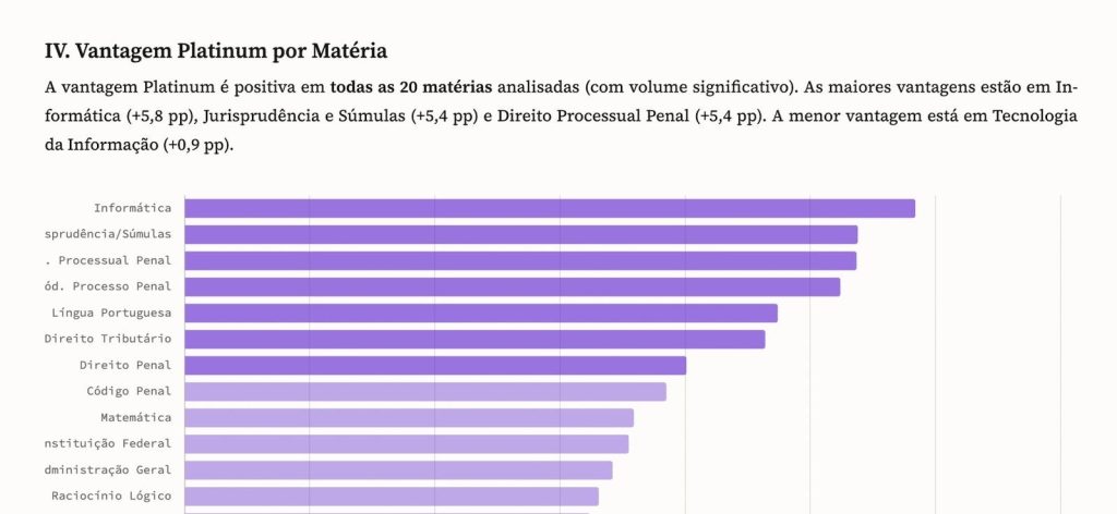 Ou seja, a assinatura Platinum não parece estar associada a um ganho localizado, mas a um efeito de desempenho transversal. Isso reforça a ideia de que o diferencial não é apenas o conteúdo de uma matéria específica, mas o ecossistema de estudo como um todo.