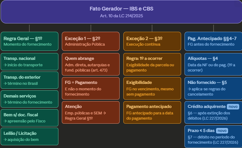 O §2º do art. 10 prevê a primeira exceção à regra geral. Para as aquisições realizadas pela administração pública direta, autarquias e fundações públicas sujeitas ao art. 473 da LC 214/2025, o momento de ocorrência do fato gerador é o pagamento, e não o fornecimento.