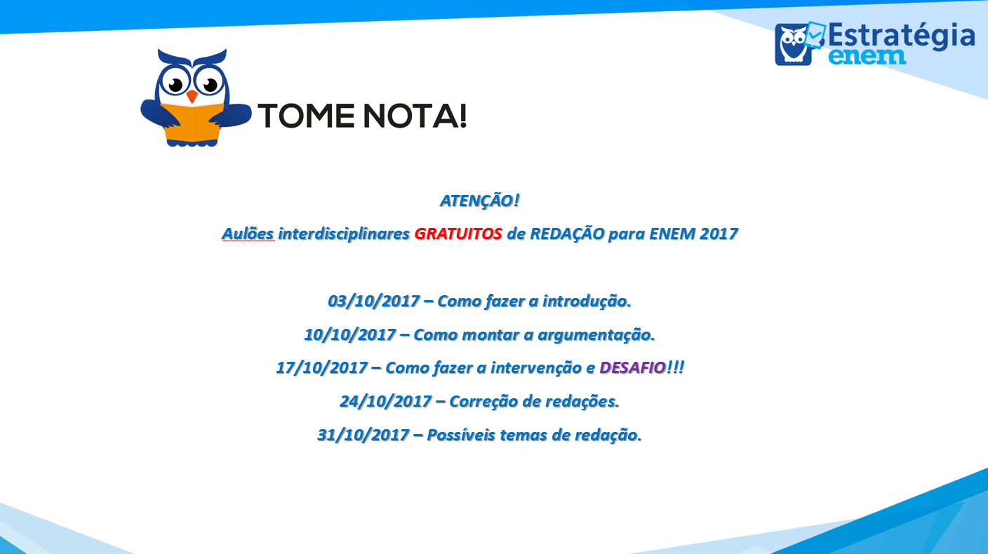 Estamos a praticamente um mês do ENEM 2017, mais do que nunca é hora de foco na redação, é hora de revisar o conteúdo já estudado e elaborar vários textos com os temas com grande inclinação para virem na prova. Além disso, 90% dos concursos estão exigindo uma redação ou respostas a questões discursivas. Sendo assim, meus amigos, todos os motivos são favoráveis para você não perder tudo que puder absorver de conteúdo de qualidade para a sua preparação! Principalmente se esse conteúdo for GRATUITO!