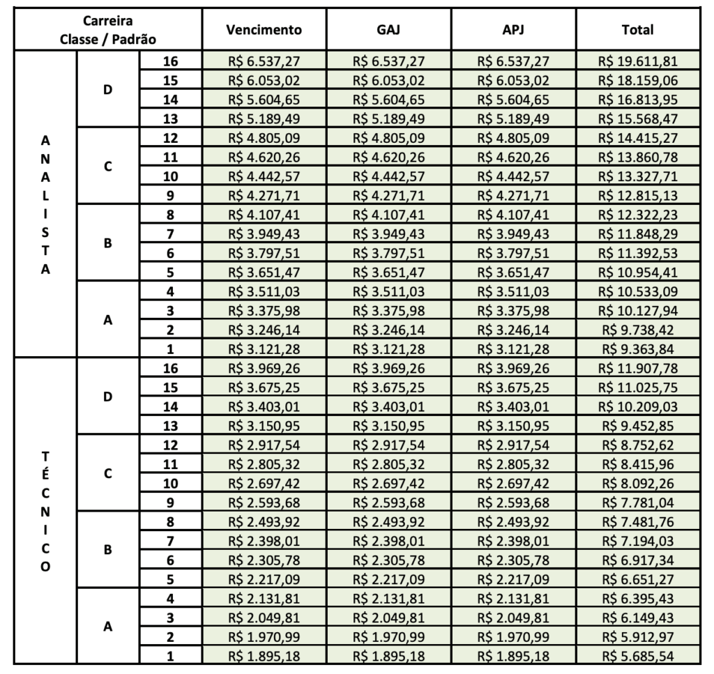 Abaixo você confere como está organizada a estrutura remuneratória do tribunal para os cargos que serão ofertados no edital.