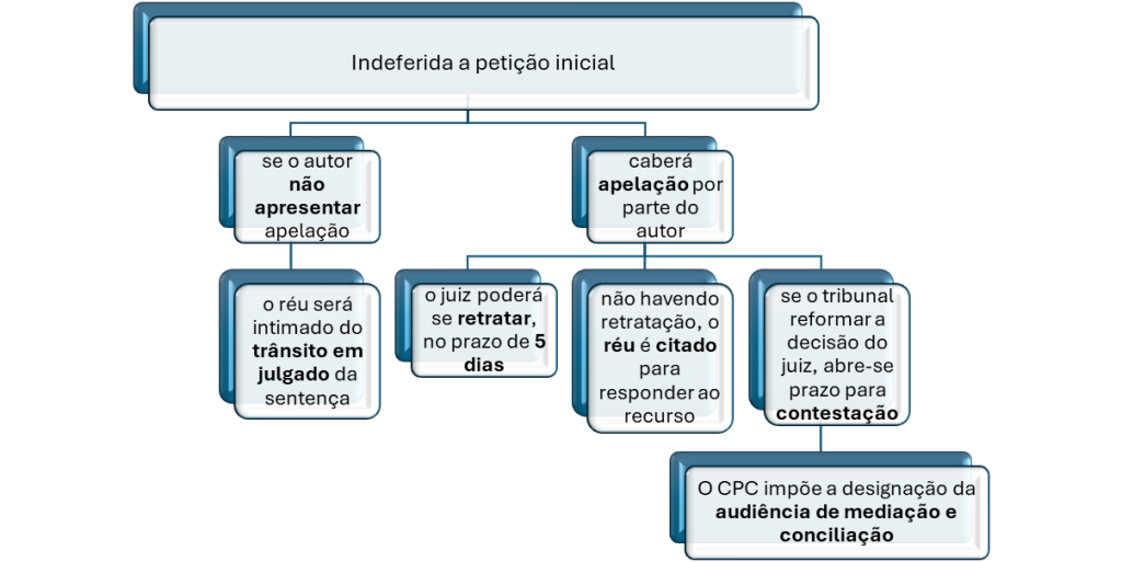 Por fim, nas situações em que a petição inicial for indeferida, o autor poderá apresentar recurso de apelação.