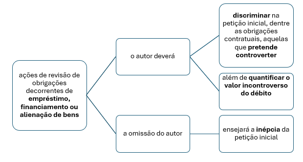 Cabe destacar que as ações cujo objeto se refiram a revisão de obrigações decorrentes de empréstimo, financiamento ou alienação de bens obrigam o autor a discriminar na petição inicial, dentre as obrigações contratuais, aquelas que pretende controverter, além de quantificar o valor incontroverso do débito.