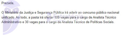 “O Ministério da Justiça e Segurança Pública irá aderir ao concurso público nacional unificado. Ao todo, a pasta irá ofertar 100 vagas para o cargo de Analista Técnico Administrativo e 30 vagas para o cargo de Analista Técnico de Políticas Sociais”.
