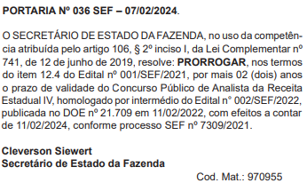 Confira logo abaixo a portaria publicada em 2024 que prorrogou a validade do último concurso até fevereiro deste ano:
