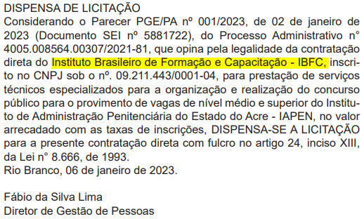 O Instituto Brasileiro de Formação e Capacitação (IBFC) foi contratado, via dispensa de licitação, como banca organizadora do novo concurso Polícia Penal AC.