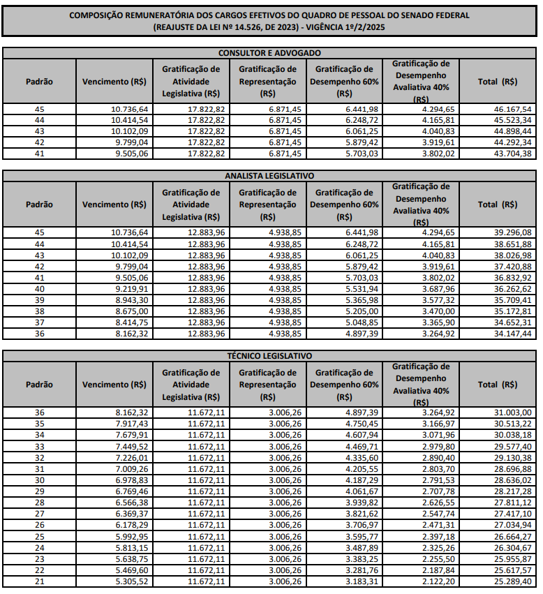 Tabela remuneratória de alguns cargos do Senado Federal:
