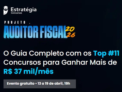 | 13/04, 19h a 20h30 | Núbia Oliveira, Victor Tanaka, Bruno Bezerra | Projeto Auditor Fiscal 2026 – O guia completo com os top concursos para ganhar mais de R$ 37 mil/mês |