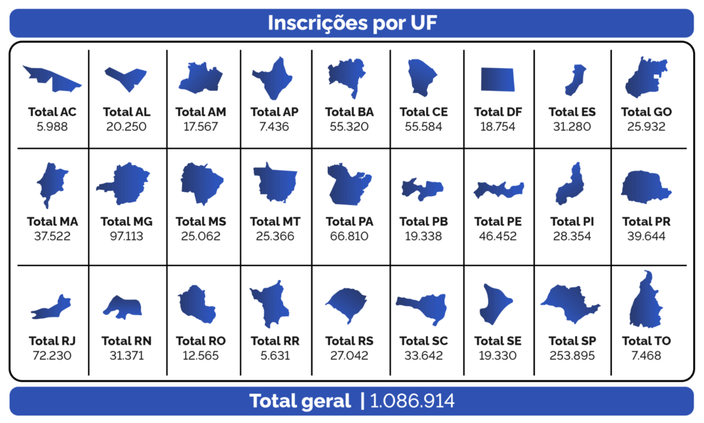 A Unidade da Federação (UF) com maior número de inscritos foi o estado de São Paulo (253.895), seguido de Minas Gerais (97.113) e Rio de Janeiro (72.230).