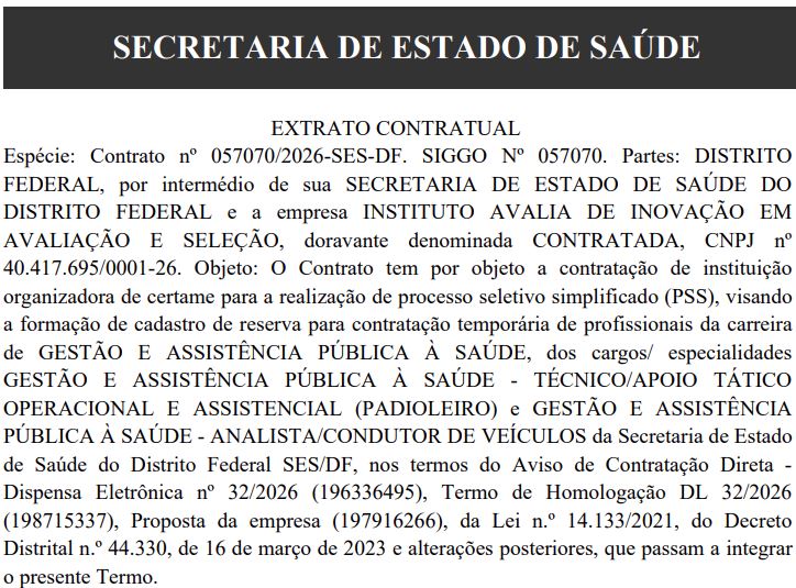 - PSS SES DF define o Instituto Avalia como a banca organizadora do novo processo seletivo simplificado.