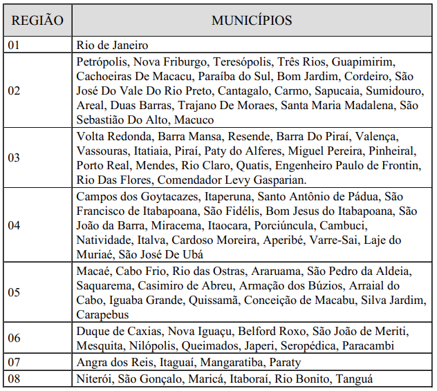 As provas deverão ser realizadas no Estado do Rio de Janeiro, de forma regionalizada, nos seguintes municípios: