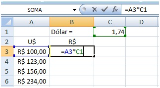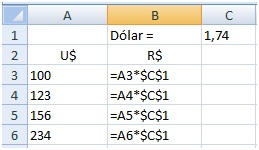 As colunas foram mantidas, mas as linhas foram ajustadas. O correto é manter a referência à célula C1 fixa. Para isto basta inserir o símbolo $ antes da referências à linha e à coluna. Neste exemplo, a fórmula em B3 ficaria: =A3*$C$1. Agora sim, quando a fórmula for copiada, a referência à célula que contém o valor do dólar será mantida.
