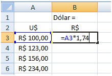 Ao copiar a fórmula – observe a referência relativa – os valores das linhas serão ajustados. Para B4, B5 e B6 a referência A3 será alterada para A4, A5 e A6 respectivamente. Ok. Mas para esta forma de calcular teríamos que modificar todas as células sempre que quiséssemos atualizar o valor do dólar. Para facilitar este trabalho, podemos criar uma célula que armazene o valor do dólar e alterar a fórmula para usar a referência adequada. Assim: