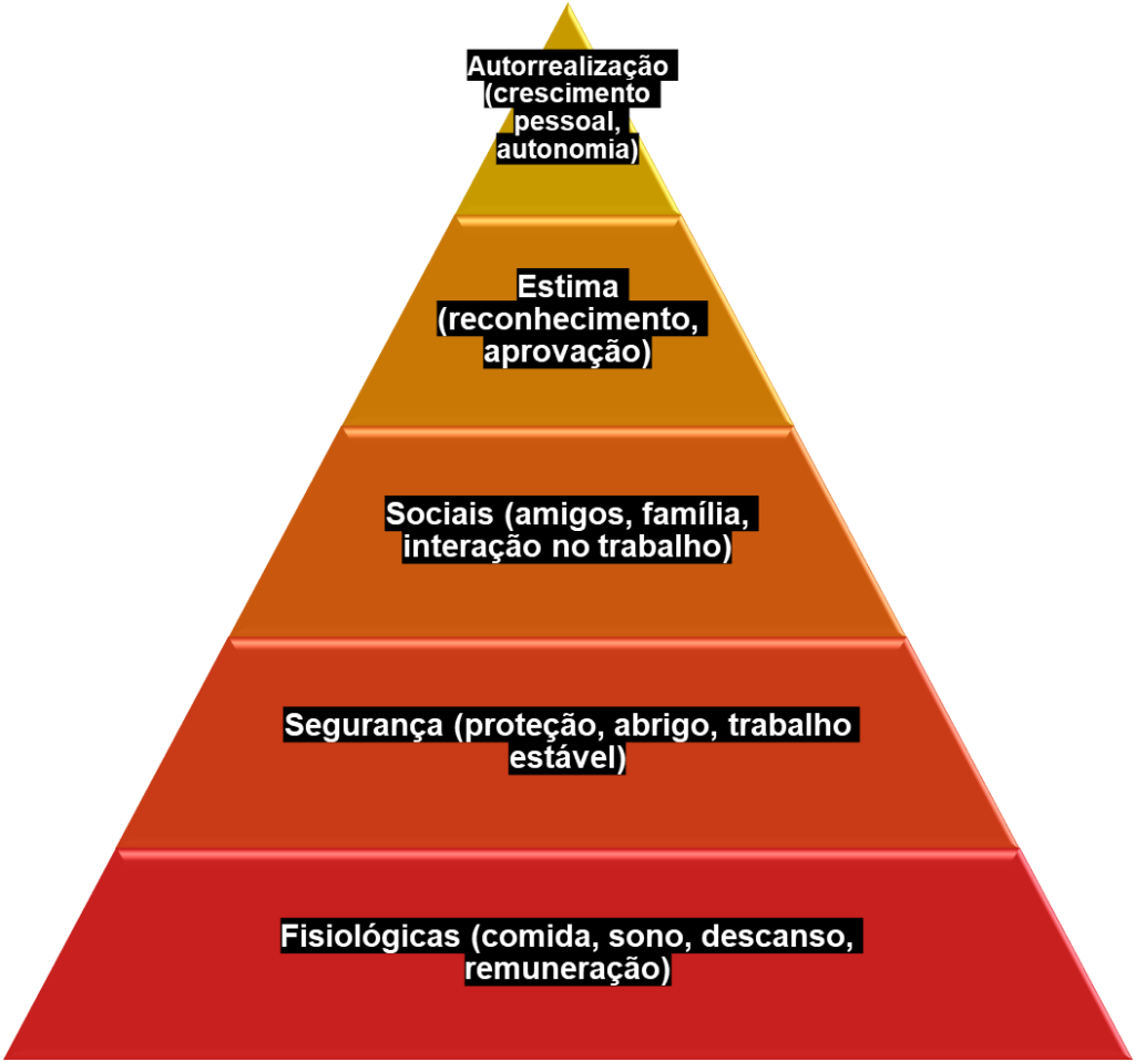 Abraham Maslow propôs que as necessidades humanas estão organizadas em uma pirâmide. Segundo o autor, uma necessidade de nível superior só surge como motivadora quando a inferior está razoavelmente satisfeita.
