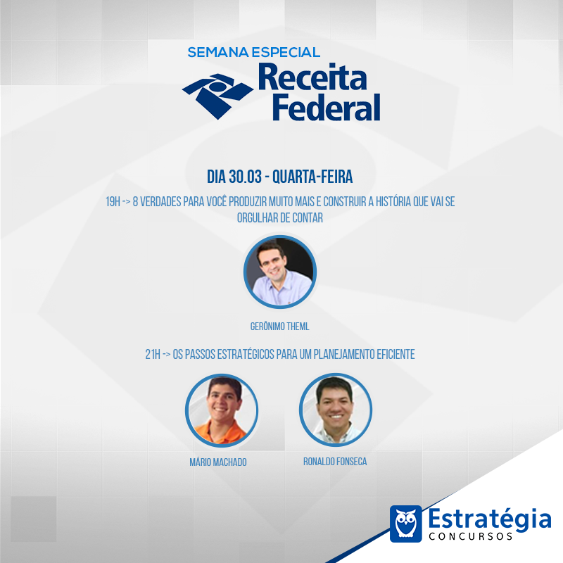 [PUBLICADO EM 25/03/2016] Semana Especial – Receita Federal do Brasil: uma semana inteira de transmissões ao vivo com tudo que você precisa e deseja saber sobre o próximo concurso da RFB. Faça já sua inscrição!