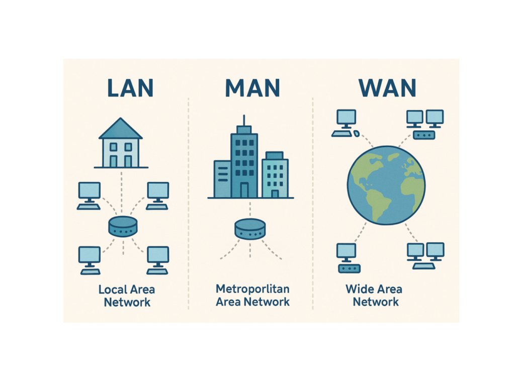 | Abrangência Geográfica | Metros a poucos quilômetros (prédio, campus) | 5 a 100 quilômetros (cidade, região metropolitana) | Centenas a milhares de quilômetros (países, continentes) |