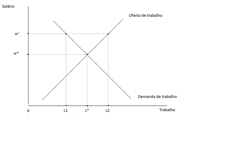 Assim, o mercado competitivo geraria um salário de mercado de w* e um emprego de L*.